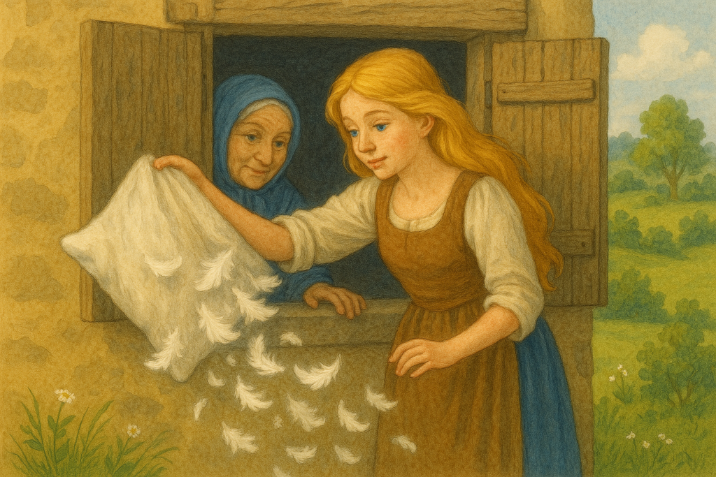 Таа се претставила како баба Зима. Таа и објаснила дека ако помогне во домашните работи, двете добро ќе се сложуваат. На баба Зима најважно и било да се истресат перниците од пердуви бидејќи тогаш ќе паѓало снег на земјата.